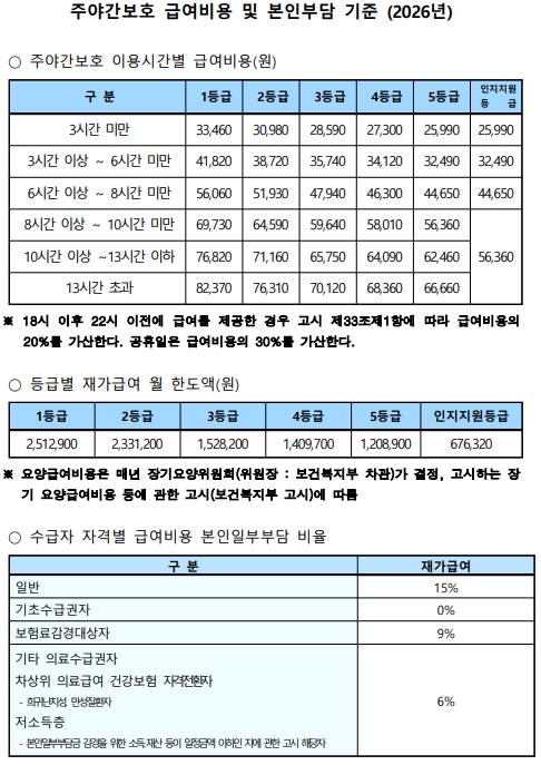 한서재가노인복지센터 2026년도 수가표 (주야간보호, 방문요양)
