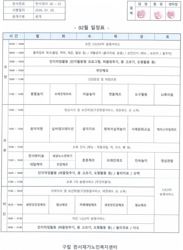 한서재가노인복지센터 2026년 2월 일정표