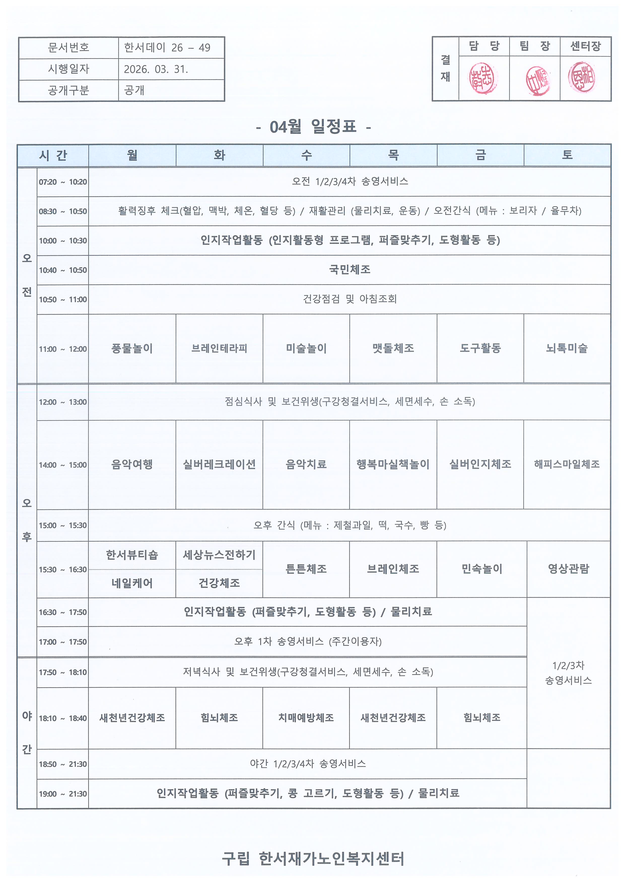 한서재가노인복지센터 2026년 4월 일정표