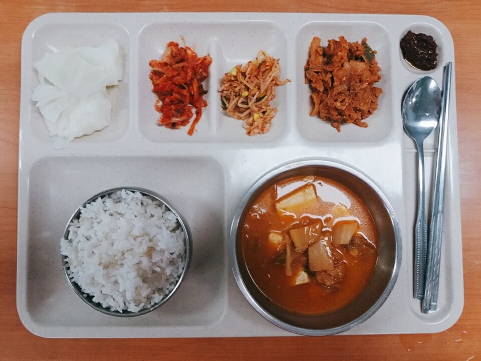 점심 잡곡밥, 청국장찌개, 제육볶음, 콩나물무침, 양배추숙회, 배추김치