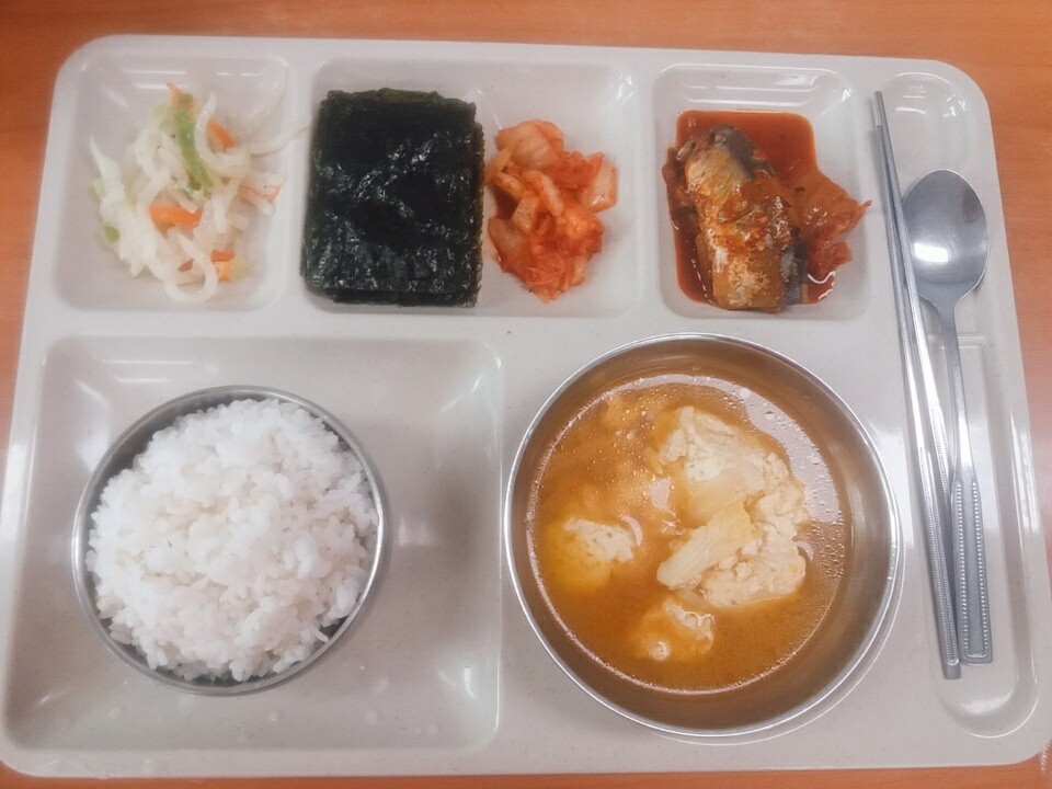 점심 잡곡밥, 순두부찌개, 꽁치김치조림, 무나물, 김구이, 배추김치
