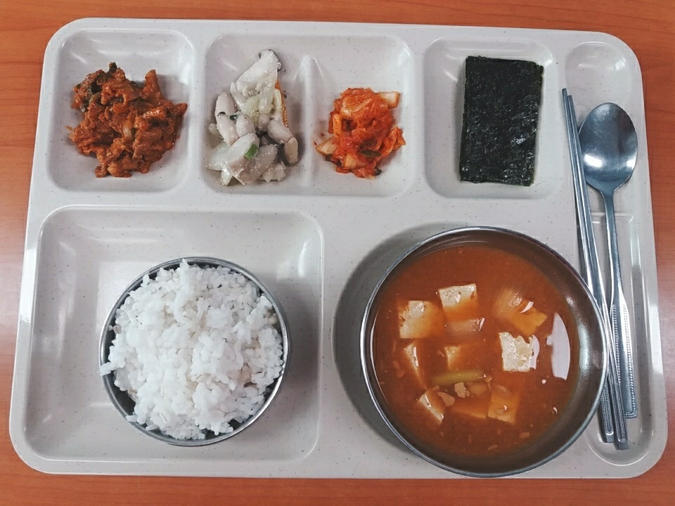 점심 잡곡밥, 청국장찌개, 제육볶음, 미니새송이볶음, 김구이, 배추김치