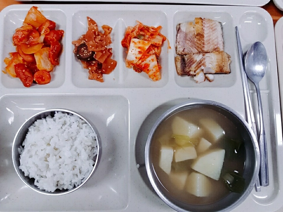 점심 잡곡밥, 감자양파국, 임연수구이, 소세지야채볶음, 오복지무침, 배추김치