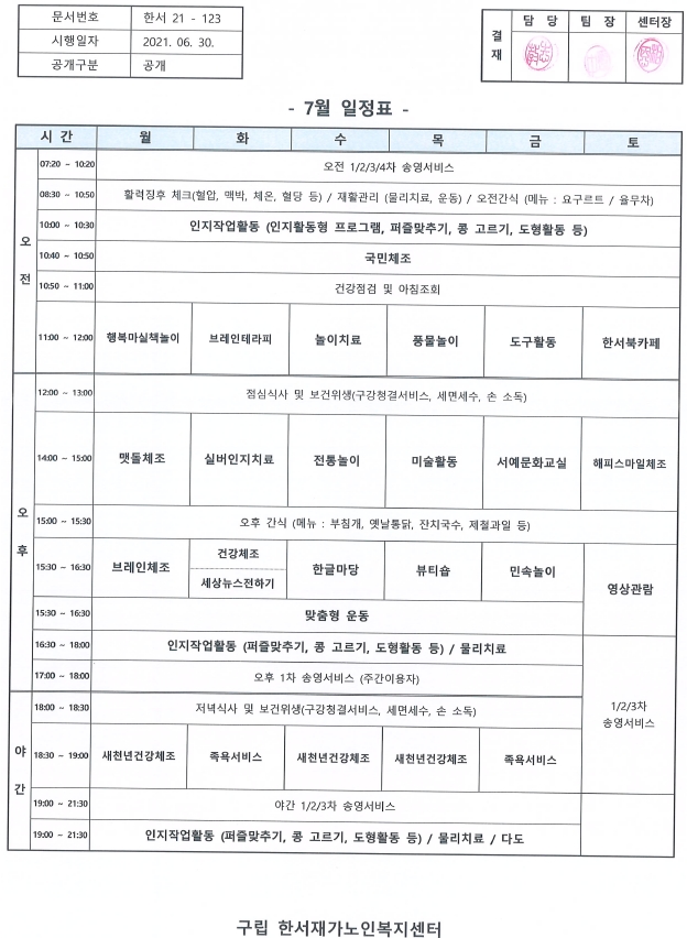 한서재가노인복지센터 7월 일정표